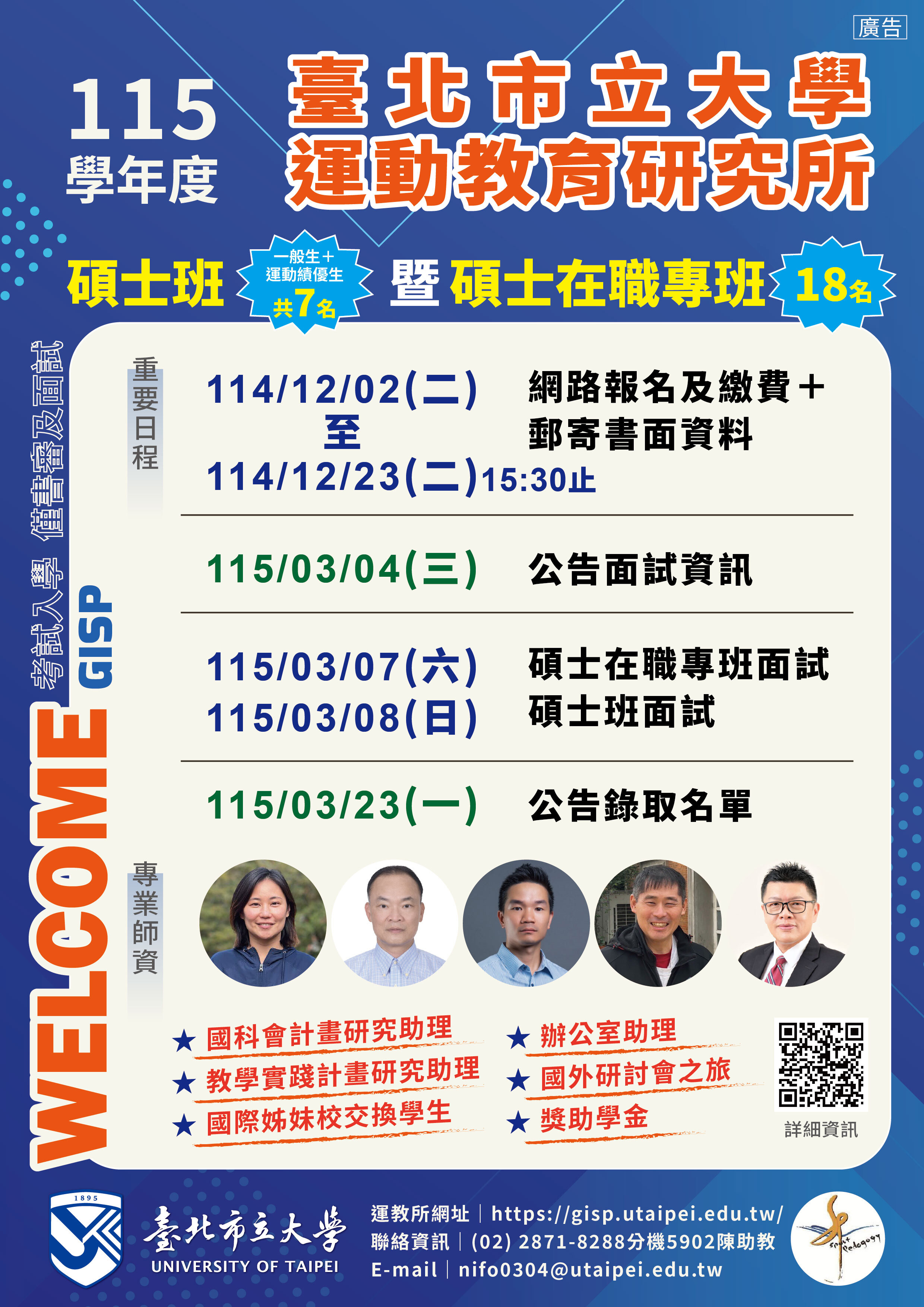 碩士班:115/3/8 (日) 運教所碩士班簡章 (←請點選下載)