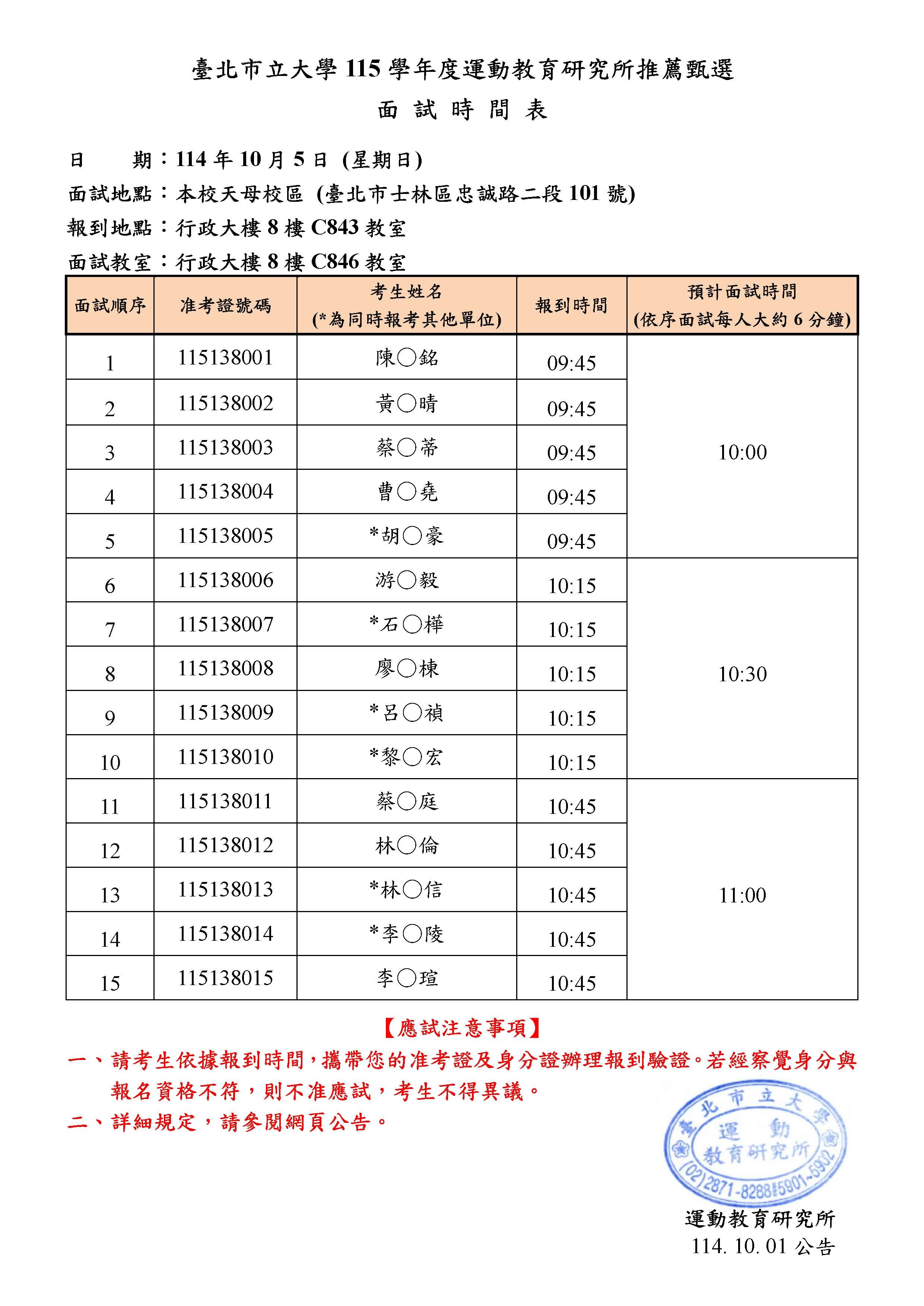 【重要公告】115學年度運動教育研究所推薦甄選面試時間公告